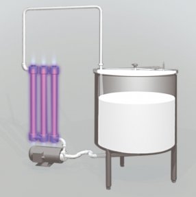 Очень тонкая стройка молока протекает вдоль стеклянного цилиндра, в котором расположены УФ-трубки: УФ-лучи (250nm) проникают в молоко и достигают бактерий. ДНК бактерий разрушается. Бактерии больше не могут размножаться.